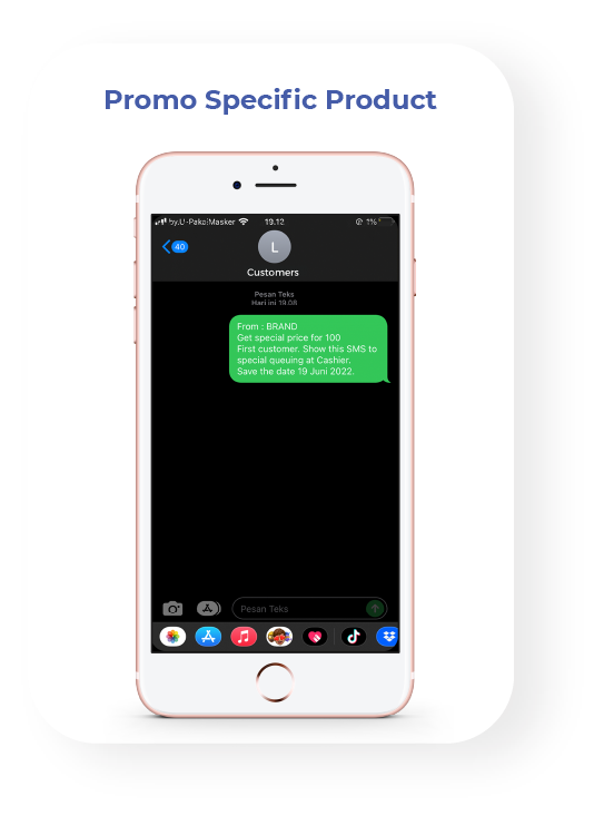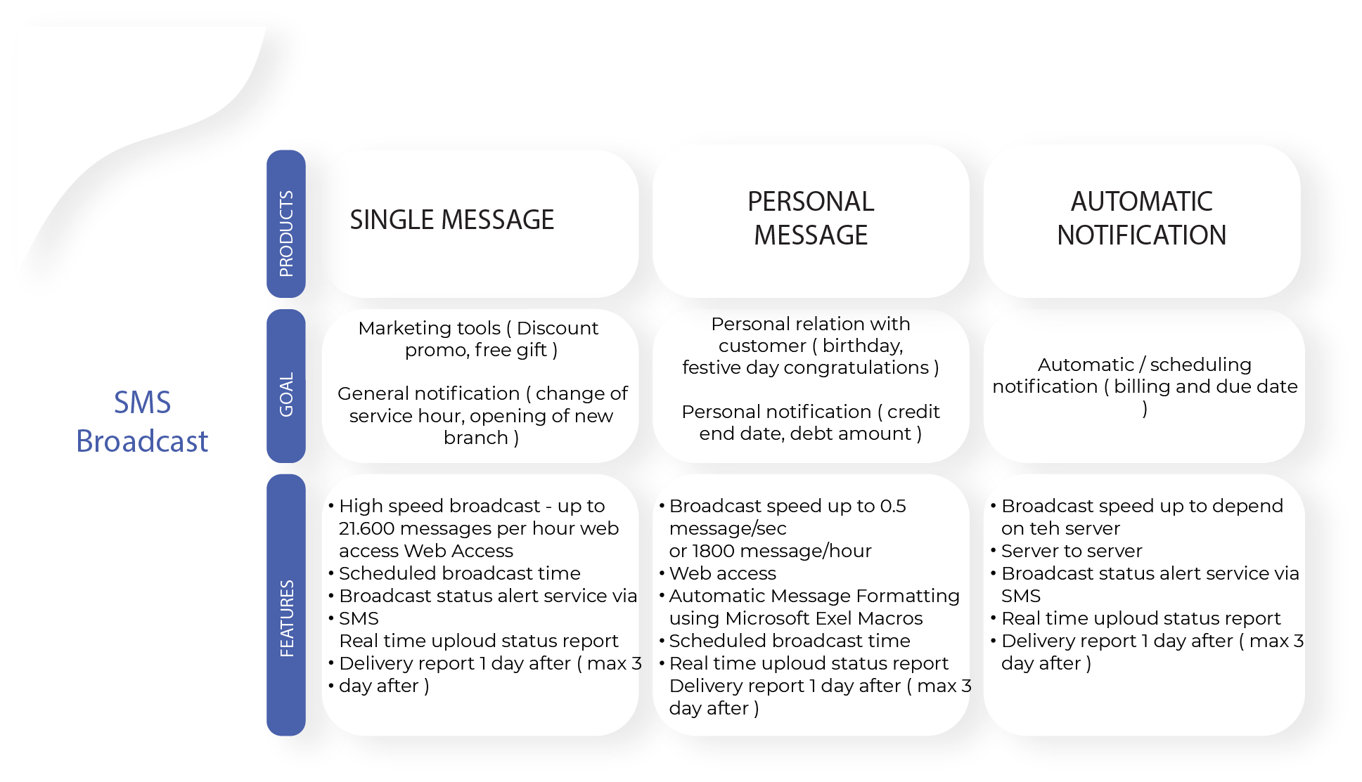 The SMS broadcast product itself is divided into 3, namely: Single message with goals Marketing tools (Discount promotions, free gifts) General notification (change of service hour, opening of new branch ), the second one is personal massage with goals Personal relation with customer (birthday, festive day congratulations ) Personal notification (credit end date, debt amount) , the last one is automatic notification with goal Automatic / scheduling notification ( billing and due date )