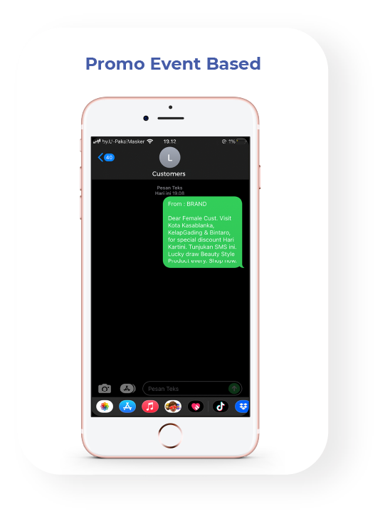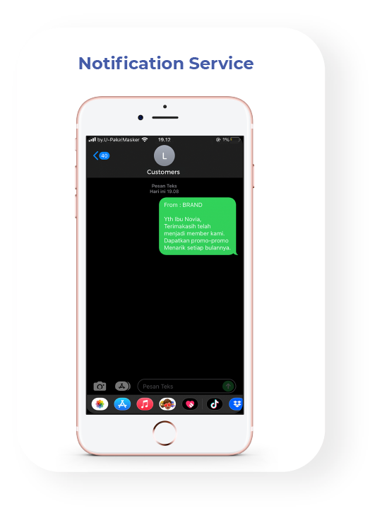 The SMS broadcast product itself is divided into 3, namely: Single message with goals Marketing tools (Discount promotions, free gifts) General notification (change of service hour, opening of new branch ), the second one is personal massage with goals Personal relation with customer (birthday, festive day congratulations ) Personal notification (credit end date, debt amount) , the last one is automatic notification with goal Automatic / scheduling notification ( billing and due date )